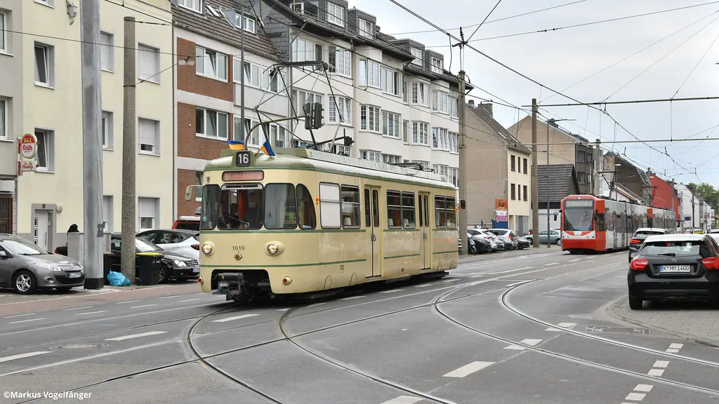 Der Sambawagen 1019 auf dem Weg zur KVB-Hauptwerkstatt auf der Neusser Straße am 15.08.2022.