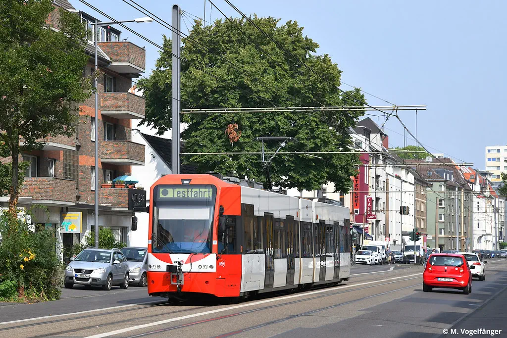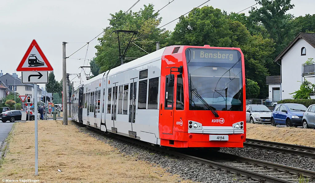 4114 wurde erneut in die aktuellen KVB-Farben lackiert. Hier zu sehen in Refrath am 20.08.2022.