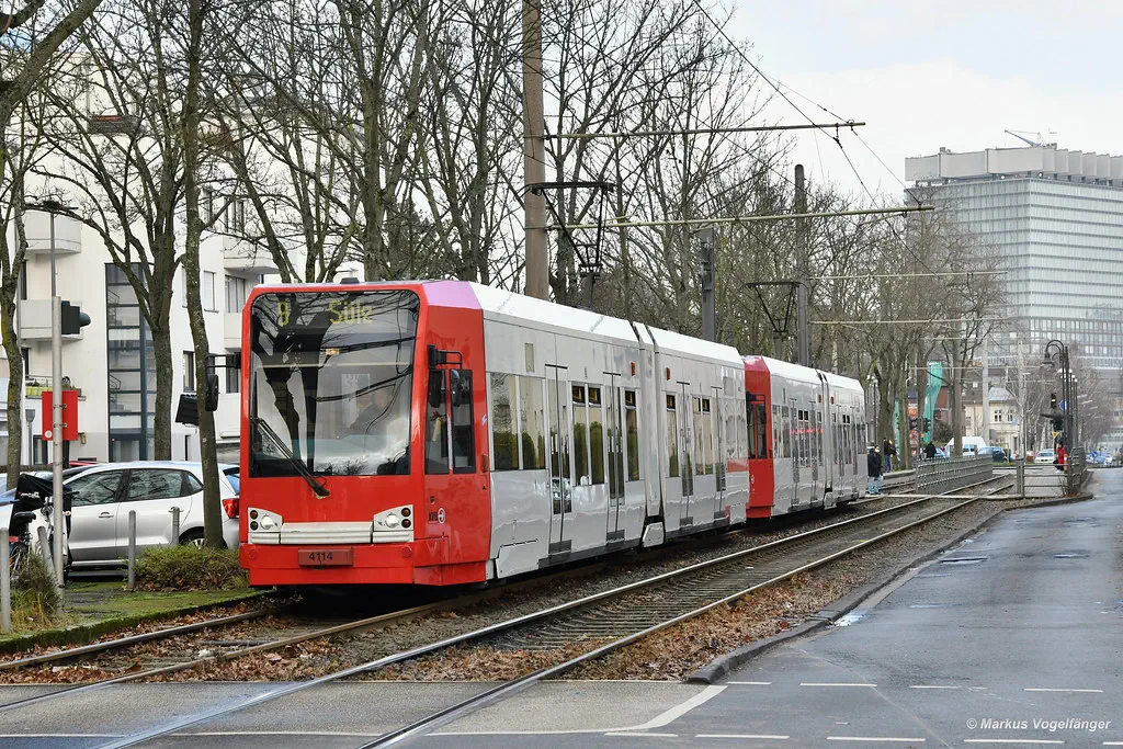 4114 wurde die KVB-Eigenwerbung "Ein Blick in unsere Zukunft" entfernt. Hier wieder in den aktuellen KVB-Farben in Sülz am 02.02.2022