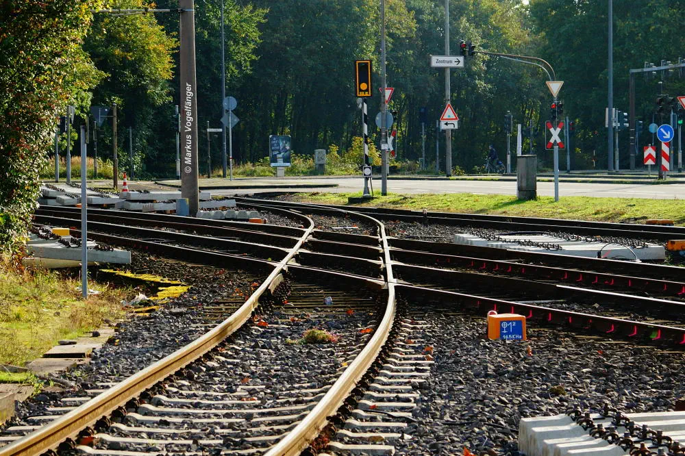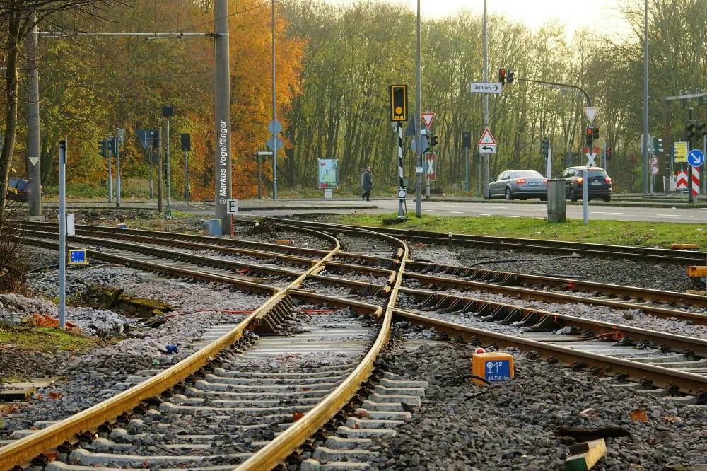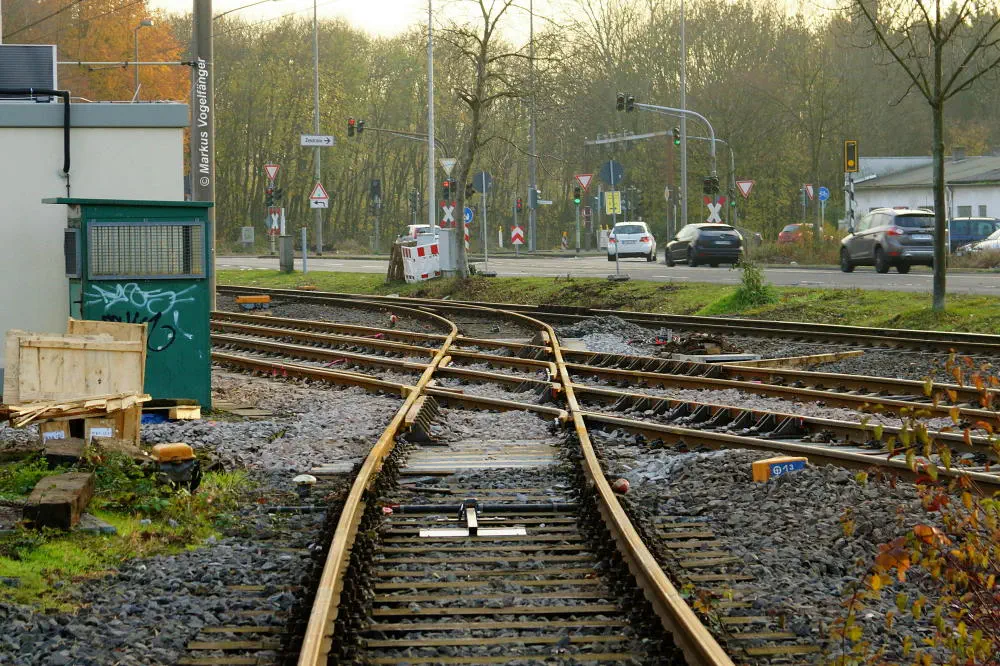 Die Streckengleise der Linie 12 mit zwei zu erneuernden Gleiskreuzungen zwischen den Haltestellen Fordwerke Mitte und Fordwerke Süd (Blickrichtung Fordwerke Süd) am 19.10.2013.