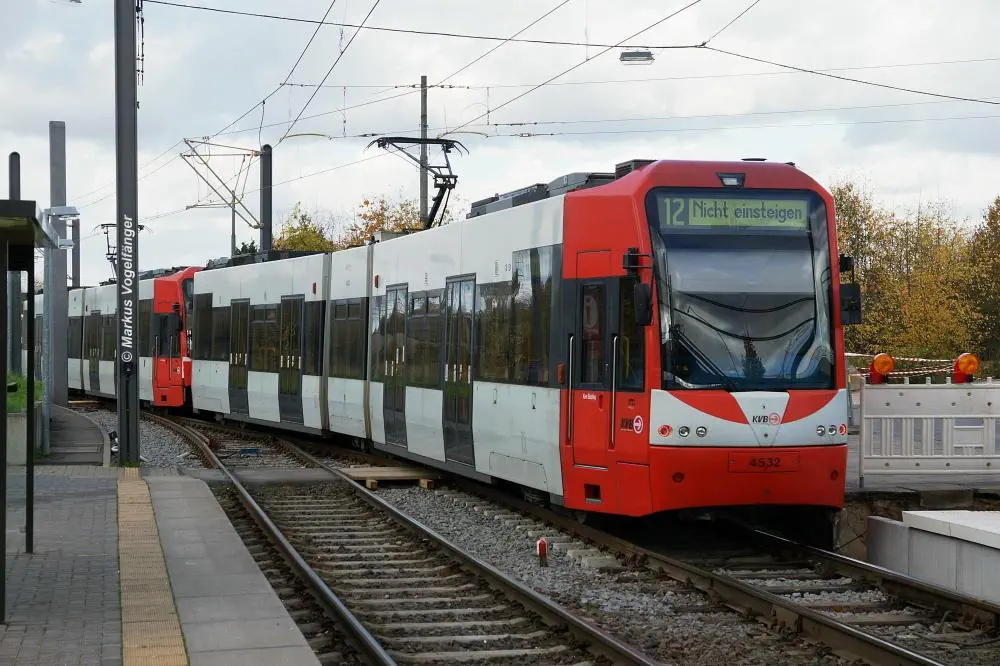 4555 hat soeben am ersten Betriebstag nach der Wendeschleifenschließung das Wendegleis in der Wende und Abstellanlage Merkenich verlassen und befährt nun das Streckengleis in Richtung Zollstock nachdem er die neue Rückfallweiche passiert hat am 28.10.2013.