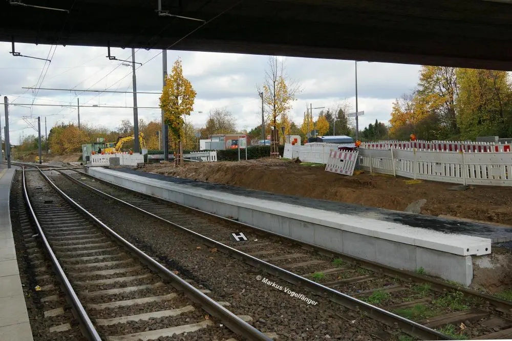 Der neue Bahnsteig der Ankunftshaltestelle "Merkenich" am 09.11.2013.