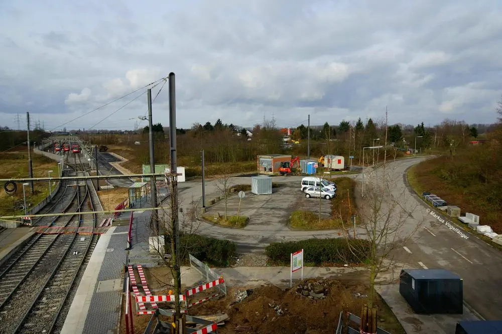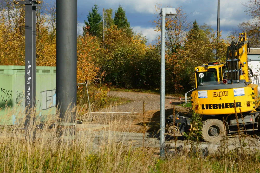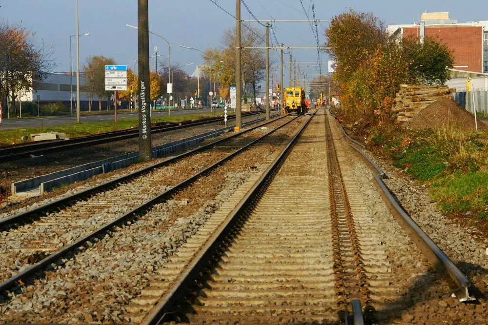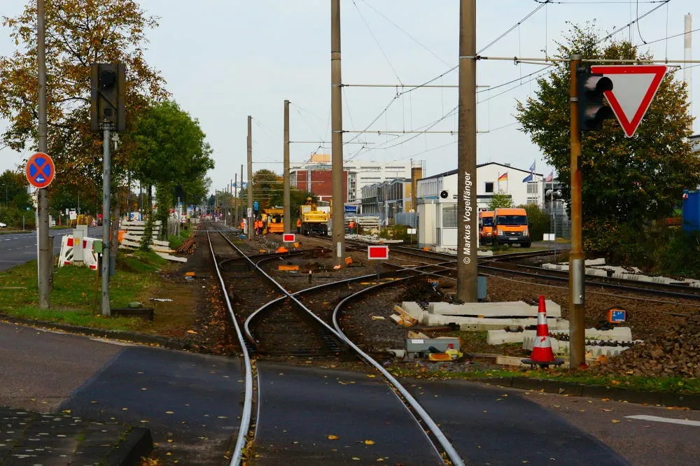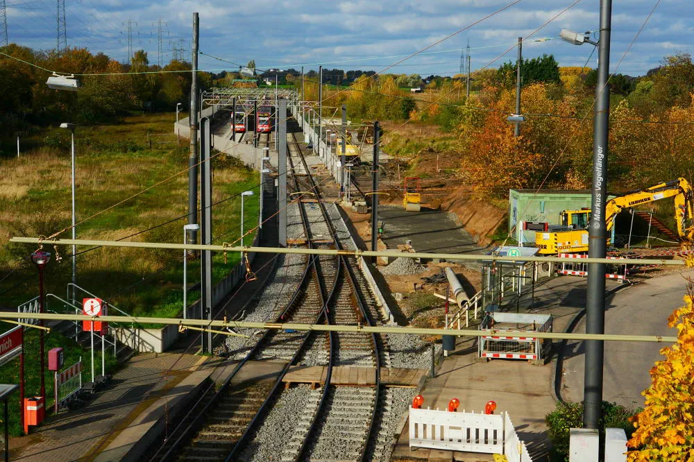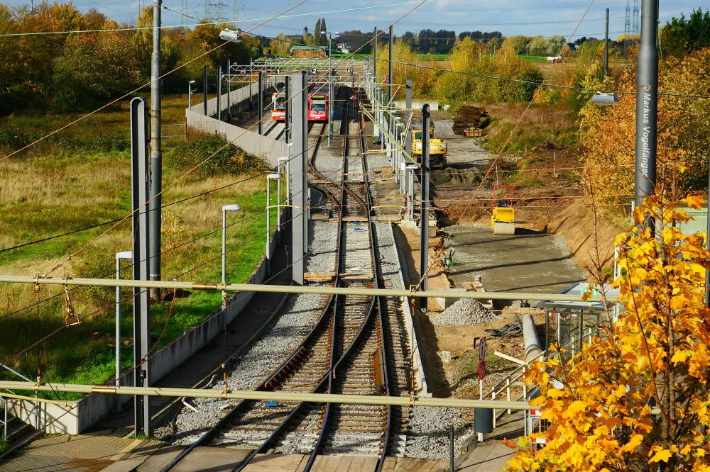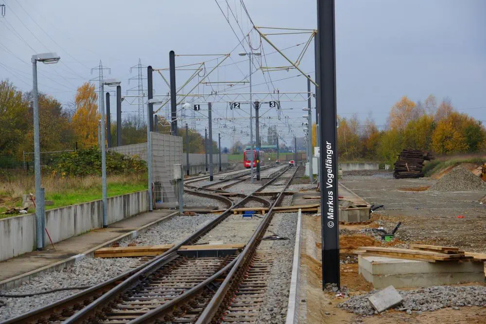 Der aktuelle Bauzustand des Streckenabschnittes zwischen den Haltestellen "Merkenich Mitte" und "Merkenich" am 09.11.2013.