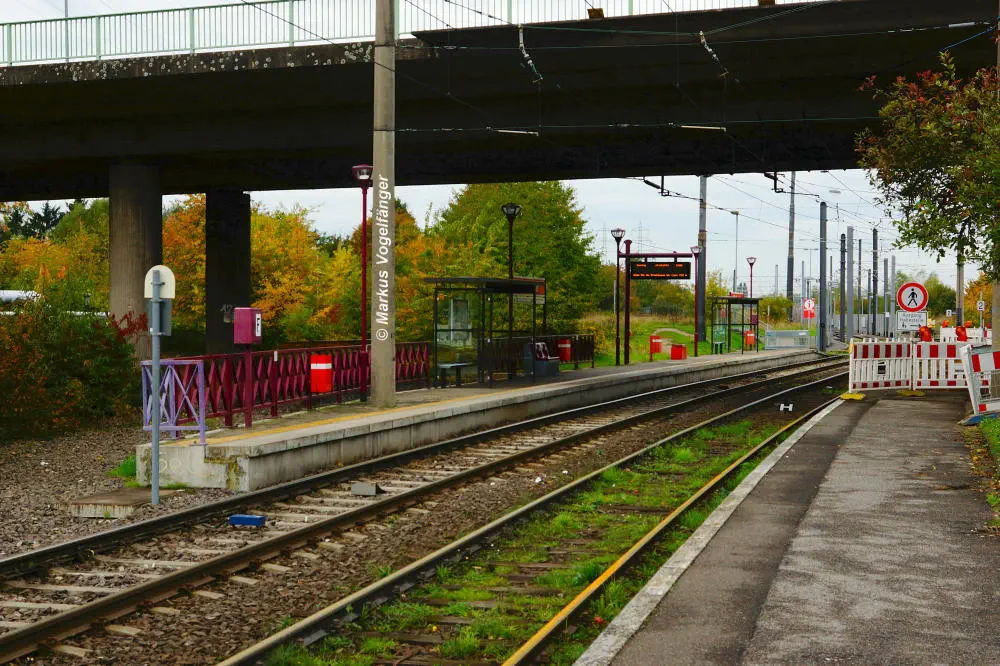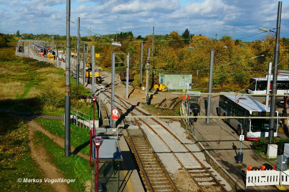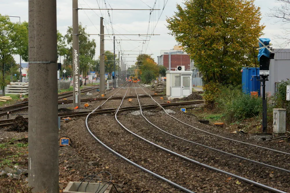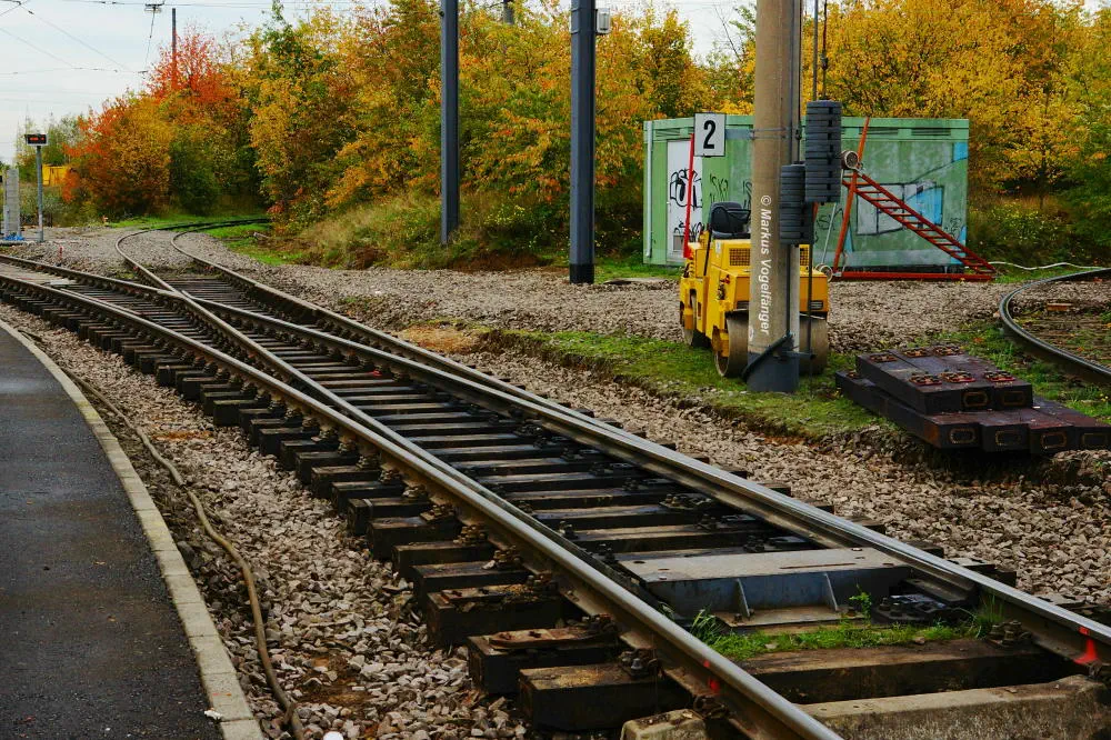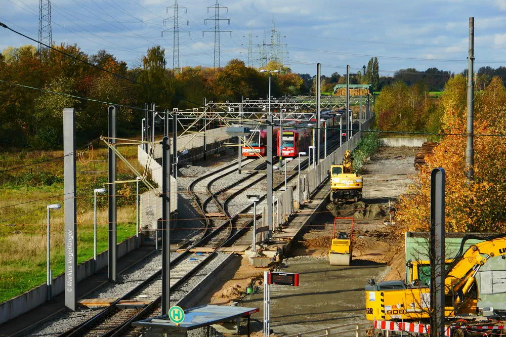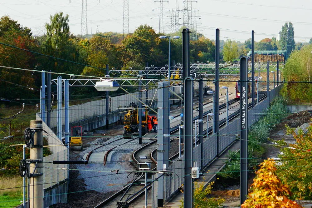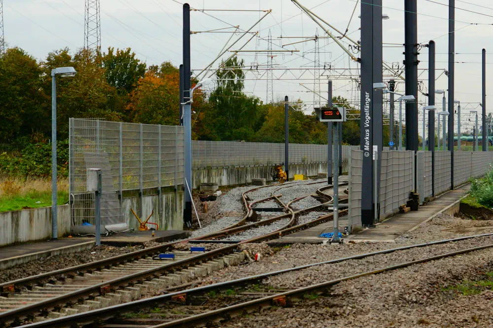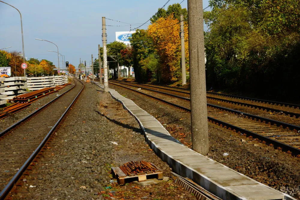Die Haltestelle Fordwerke Mitte am 19.10.2013. Auf der rechten Seite wurde das Gleisbett bereits mit neuen Schwellen und gereinigtem Schotter versehen.