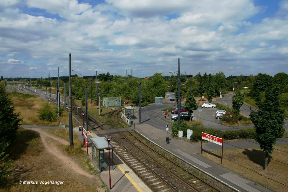 Die Ankunfts (hinten) und Abfahrtshaltestelle (vorne) Merkenich am 18.10.2013. Rechts ist der abgetragene Ankunftsbahnsteig zu sehen.
