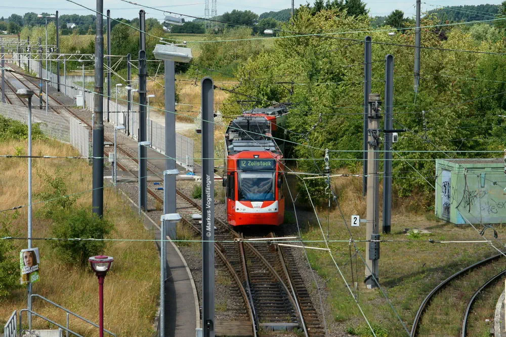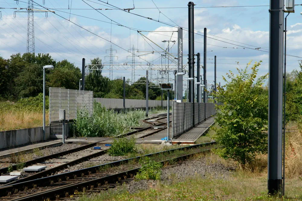 Die Streckengleise der Linie 12 zwischen den Haltestellen Merkenich und Merkenich Mitte.