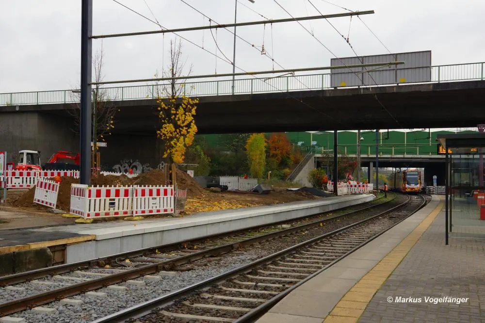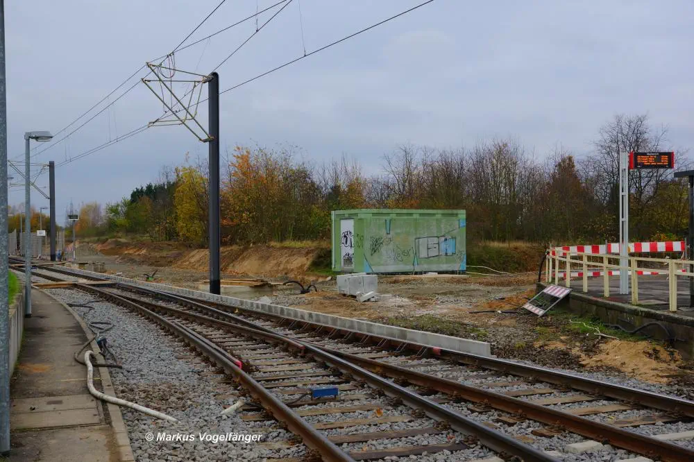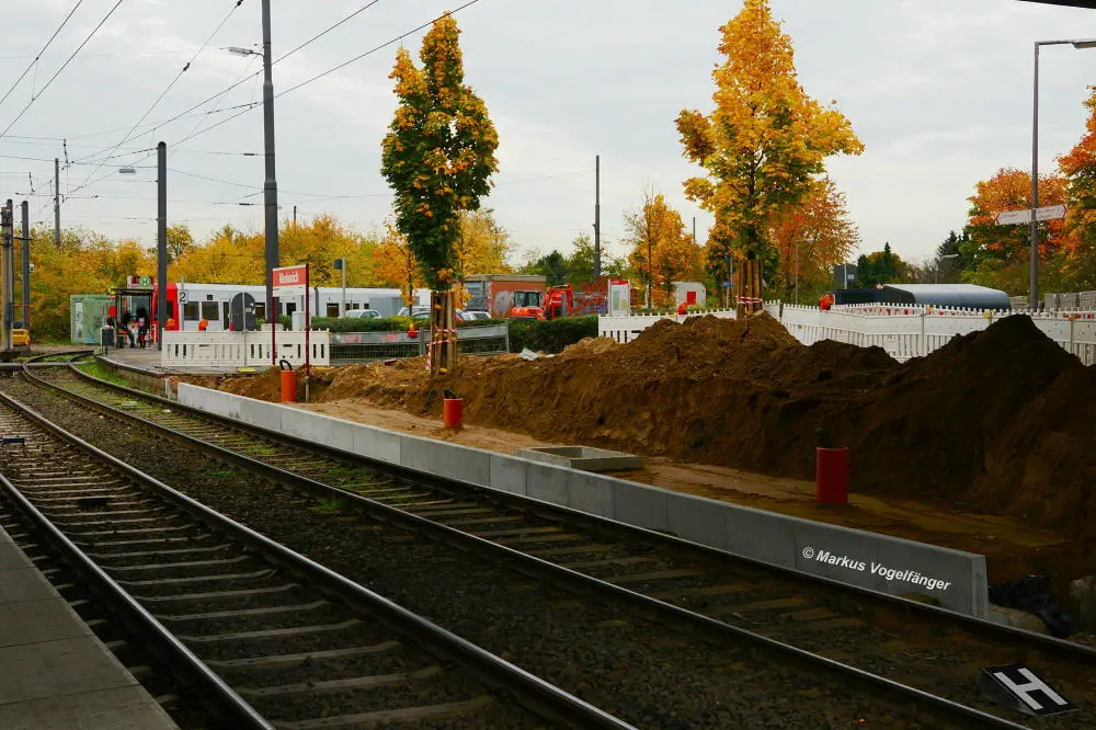 Die Ankunftsbahnsteig Merkenich (im Hintergrund) am 18.10.2013. Er wurde provisorisch um einige Meter Richtung Merkenich Mitte verlegt.