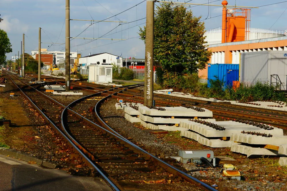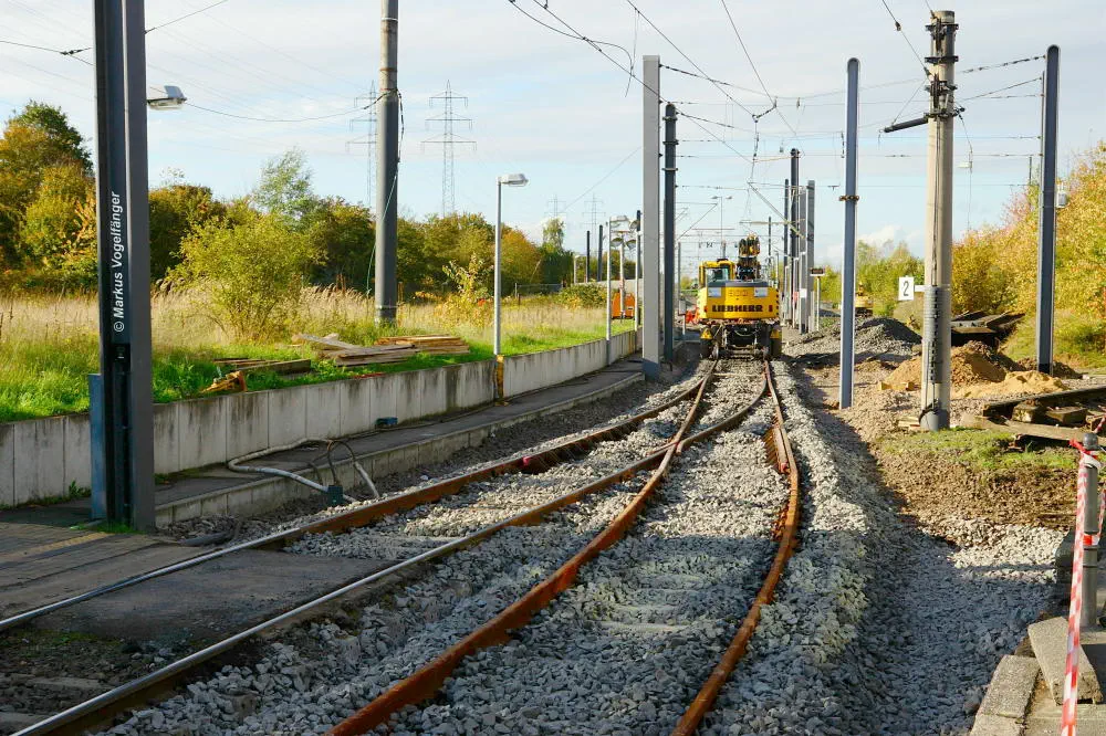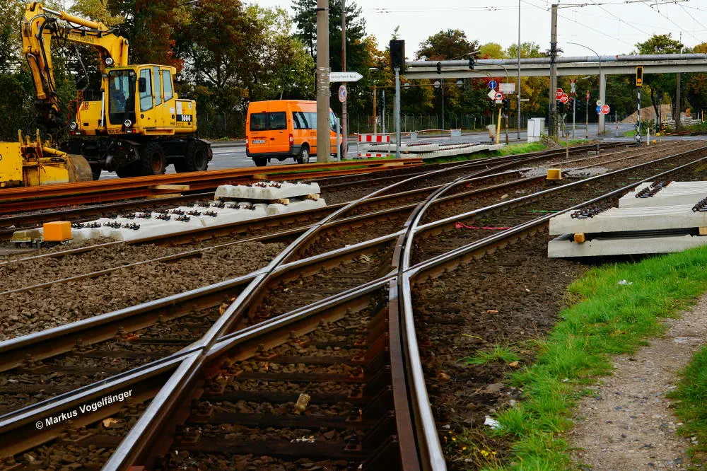 Die Haltestelle Fordwerke Nord am 19.10.2013. Die neuen Schwellen werden provisorisch am alten Gleis befestigt um das neue Gleisbett mit dem vorher gereinigten vorhandenen Schotter herzustellen.