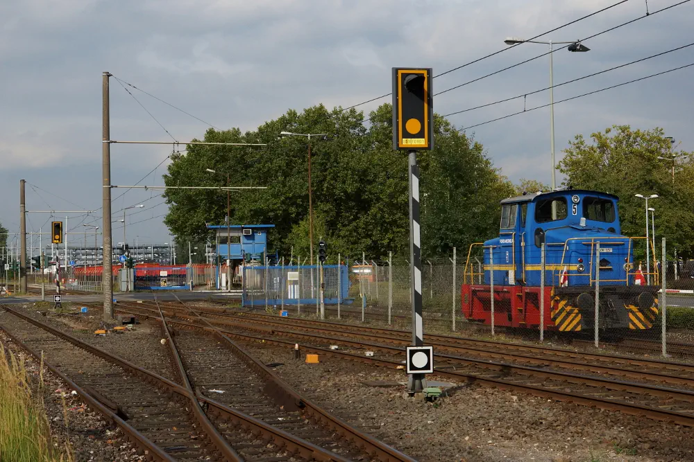 Ein Güterzug auf der Emdener Straße zwischen den Haltestellen Fordwerke Mitte und Fordwerke Nord am 19.10.2013. Im Vordergrund sind die zu erneuernden Streckengleise der Linie 12 zu sehen.