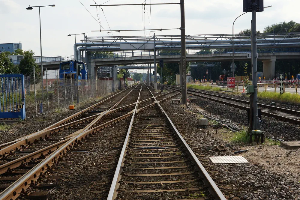 Blick von der Bremerhavener Straße auf die Emdener Straße. Auf dem linken Streckengleis wurde bereits das Gleisbett erneuert wobei der Schotter gereinigt wurde und neue Schwellen verlegt worden sind. Rechts ist das alte Gleisbett mit pinken Markierungen an den Gleisen für die neue Position der neuen Schwellen zu sehen. Nach der Fertigstellung des neuen Gleisbettes werden dann die Schienen und die Gleiskreuzungen erneuert.