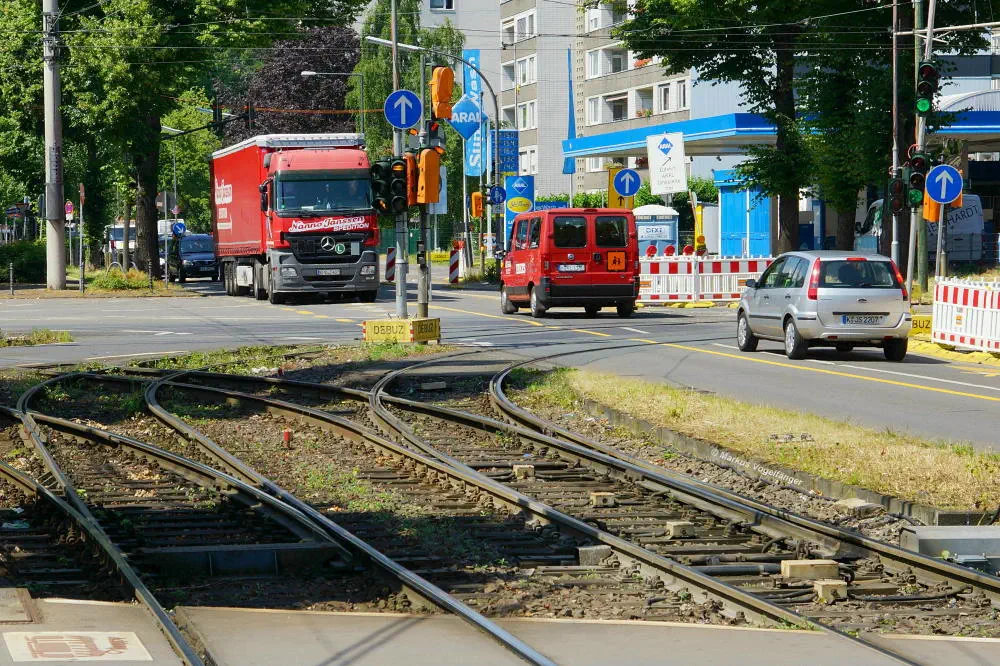 Das Gleiskreuz Wilhelm-Sollmann-Straße/Neusser Straße vor Beginn der Bauarbeiten am 02.07.2014.