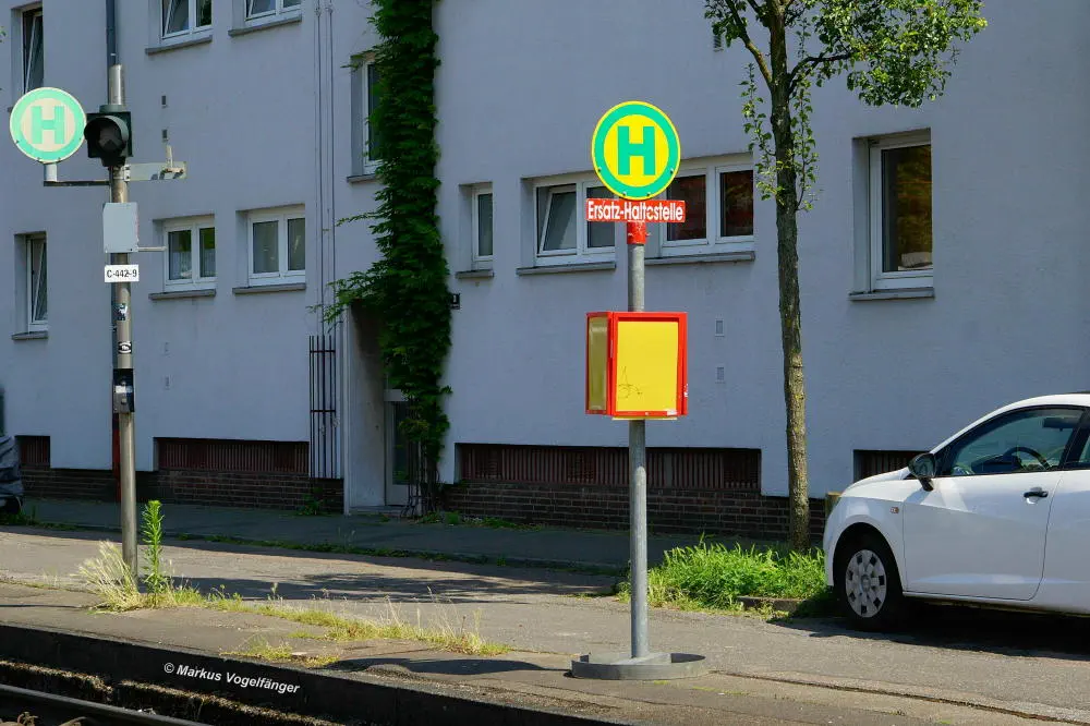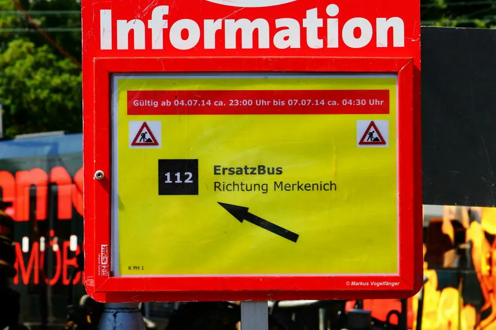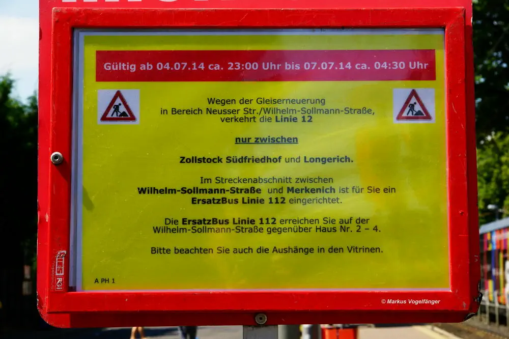 Informationstafeln an der Haltestelle Wilhelm-Sollmann-Straße vor dem Beginn der Bauarbeiten am 02.07.2014.