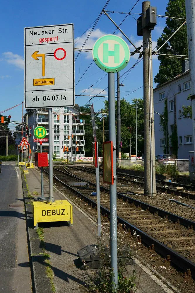 Die Haltestelle Scheibenstraße auf der Neusser Straße vor dem Beginn der Bauarbeiten am 02.07.2014.
