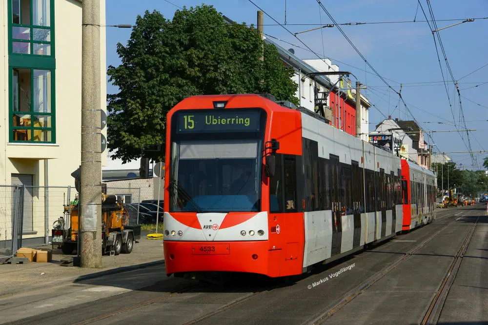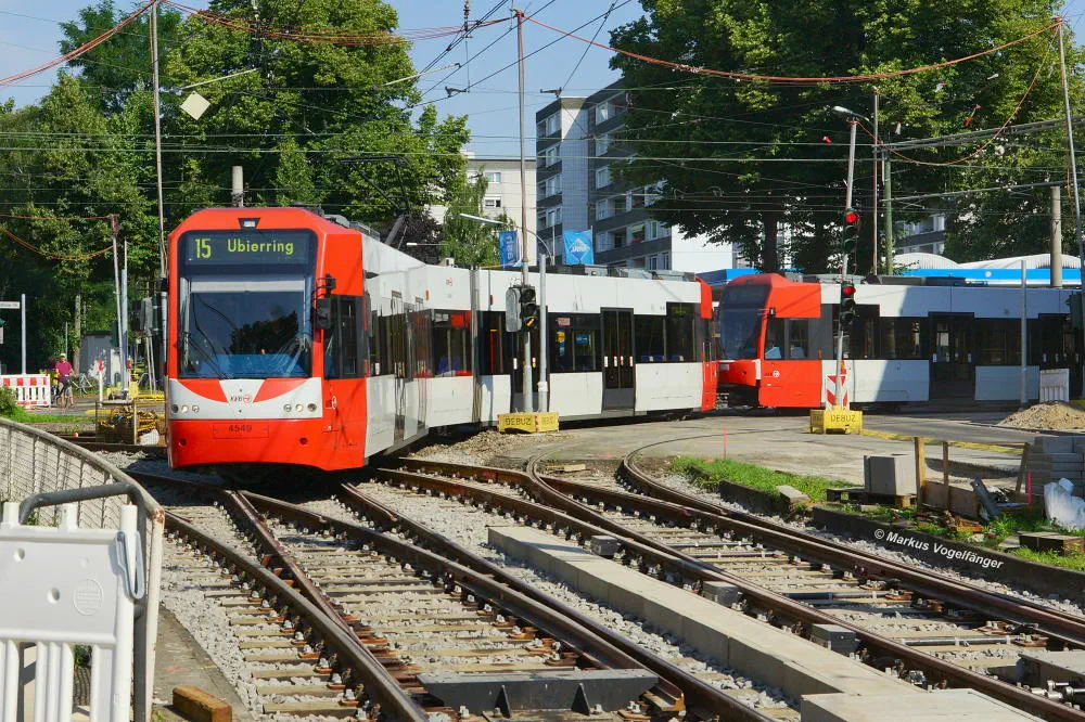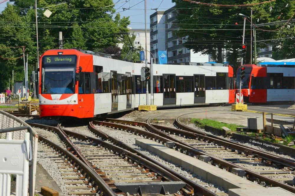 4549 als umgeleitete Linie 15 von Niehl kommend auf der Gleiskreuzung Wilhelm-Sollmann-Straße/Neusser Straße während Bauphase 3 am 02.08.2014.