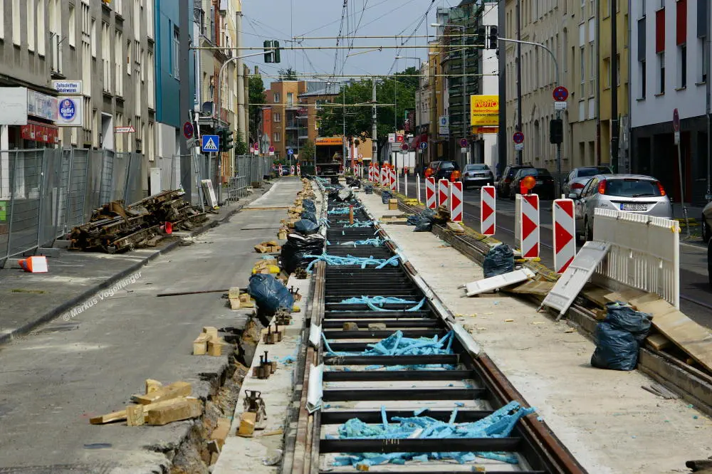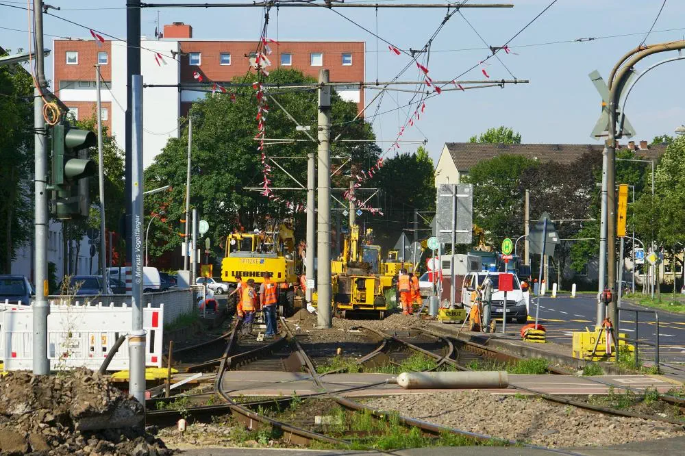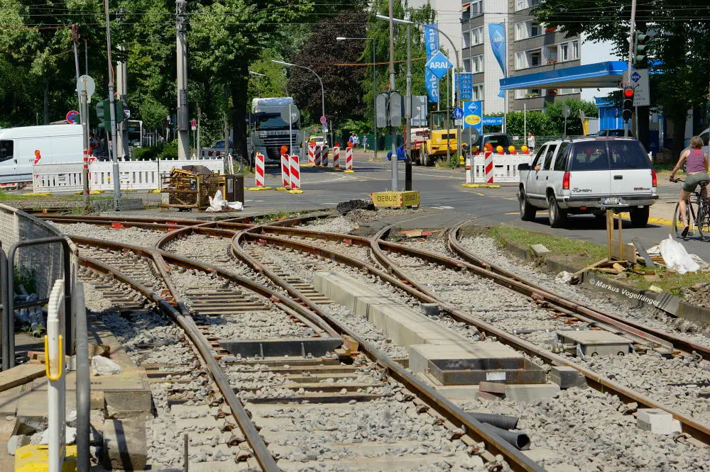 Das Gleiskreuz Wilhelm-Sollmann-Straße/Neusser Straße während Bauphase 1 am 05.07.2014.