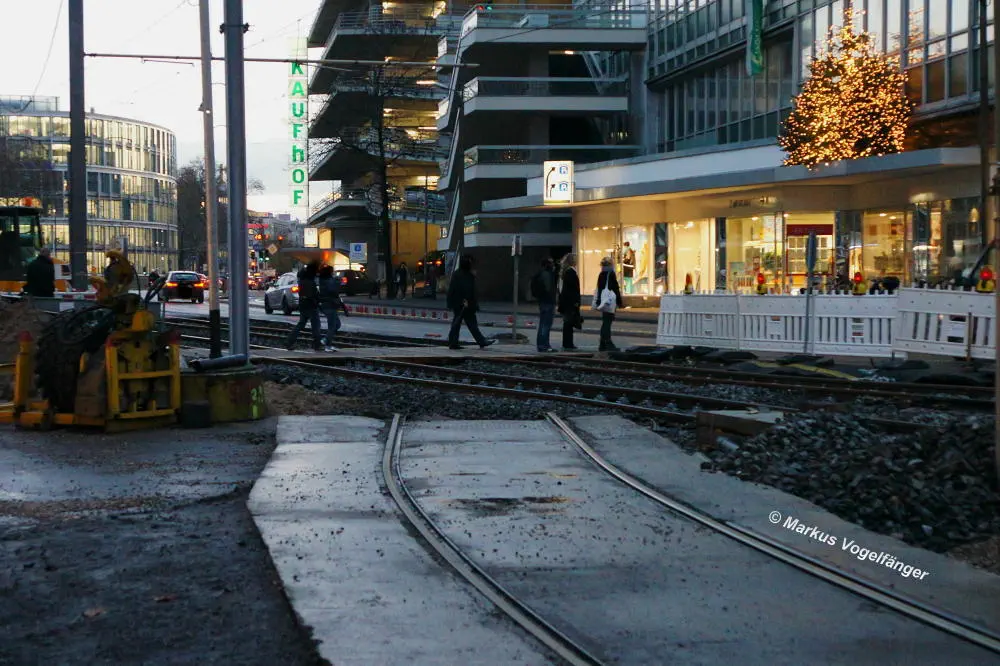 der neue Gleiswechsel wurde fertiggestellt. In der Mitte ist das neue Streckengleis Richtung Heumarkt zu sehen.