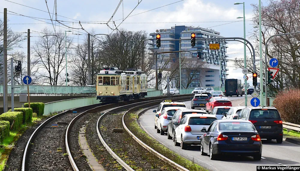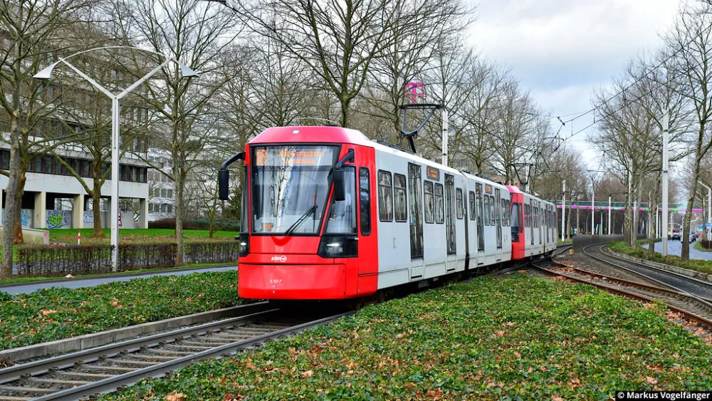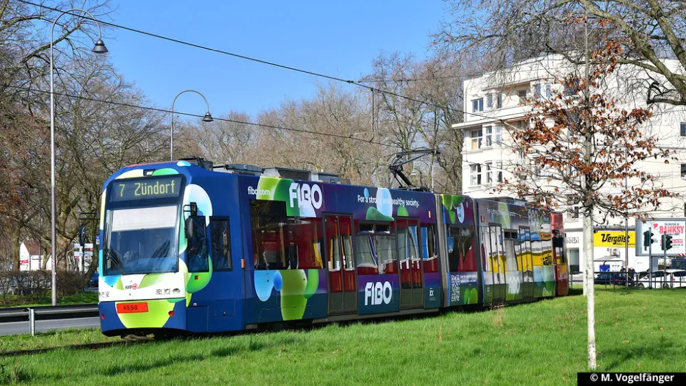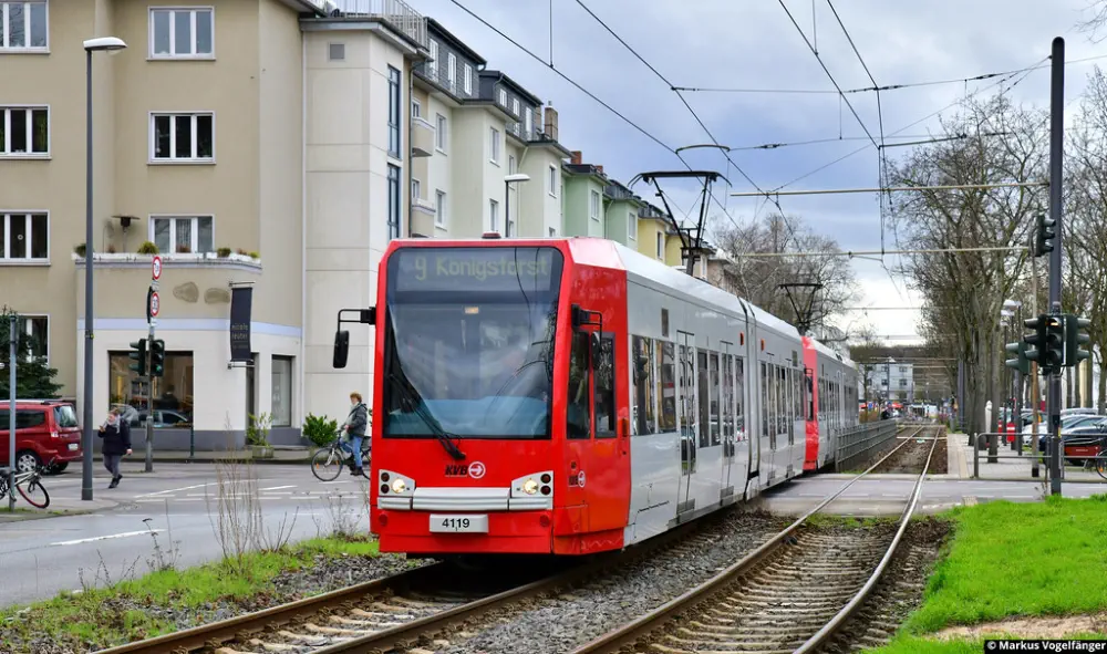 4119 wurde die Ganz-Reklame "Schumacher Aufzüge" entfernt. Hier wieder in den aktuellen KVB-Farben kurz nach der Haltestelle Mommsenstraße am 23.02.2024.