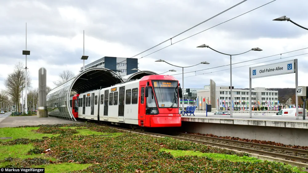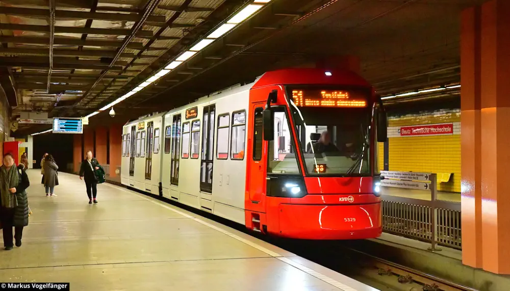 5329 während einer Testfahrt an der Haltestelle Deutz Technische Hochschule am 23.02.2024.