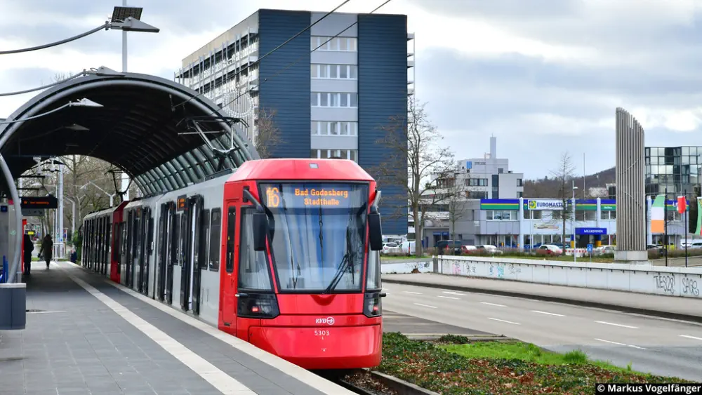 HF6 5303 und 5307 als Linie 16 in Bonn an der Haltestelle Olof-Palme-Allee und in Uedorf am 23.02.2024.