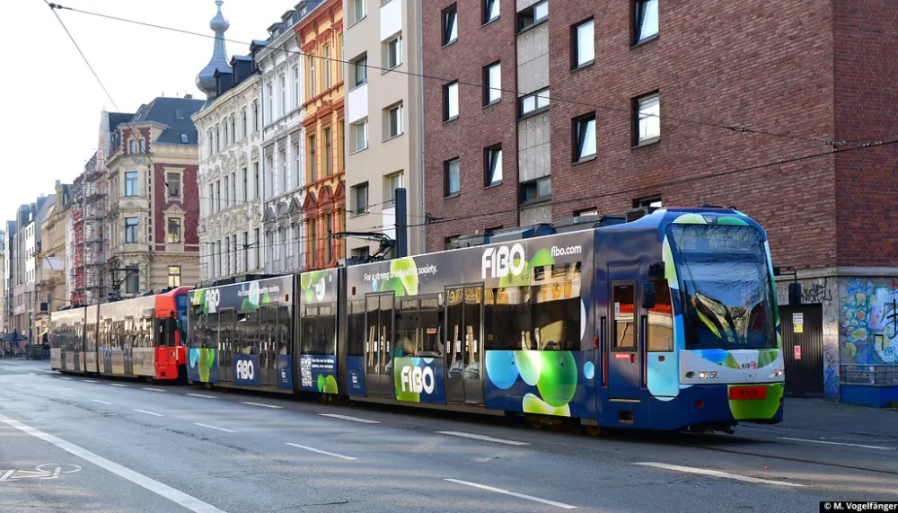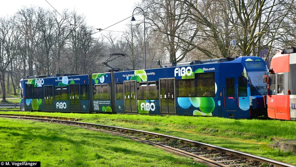 4558 wurde eine neue Ganz-Reklame "FIBO" angebracht. Hier kurz vor der Haltestelle Moltkestraße am 08.03.2024.
